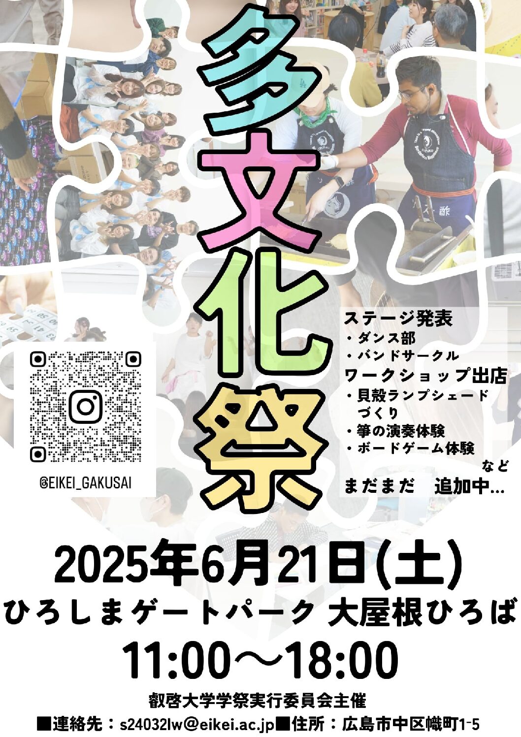 叡啓大学 学生祭実行委員主催のイベント『多文化祭』。ダンスや音楽パフォーマンス、アートの展示、ワークショップなど、楽しい企画が盛りだくさん!多様なバックグラウンドを持つ叡啓大学の学生達がさまざまな企画を通して文化の魅力をお届けします! 【問い合わせ】叡啓大学学祭実行委員会・メールs24032lw@eikei.ac.jp