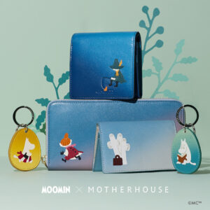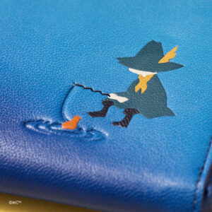 グラデーションレザーを風景に見立てて、自然のなかで生きるムーミン谷の仲間たちを描いた革小物。