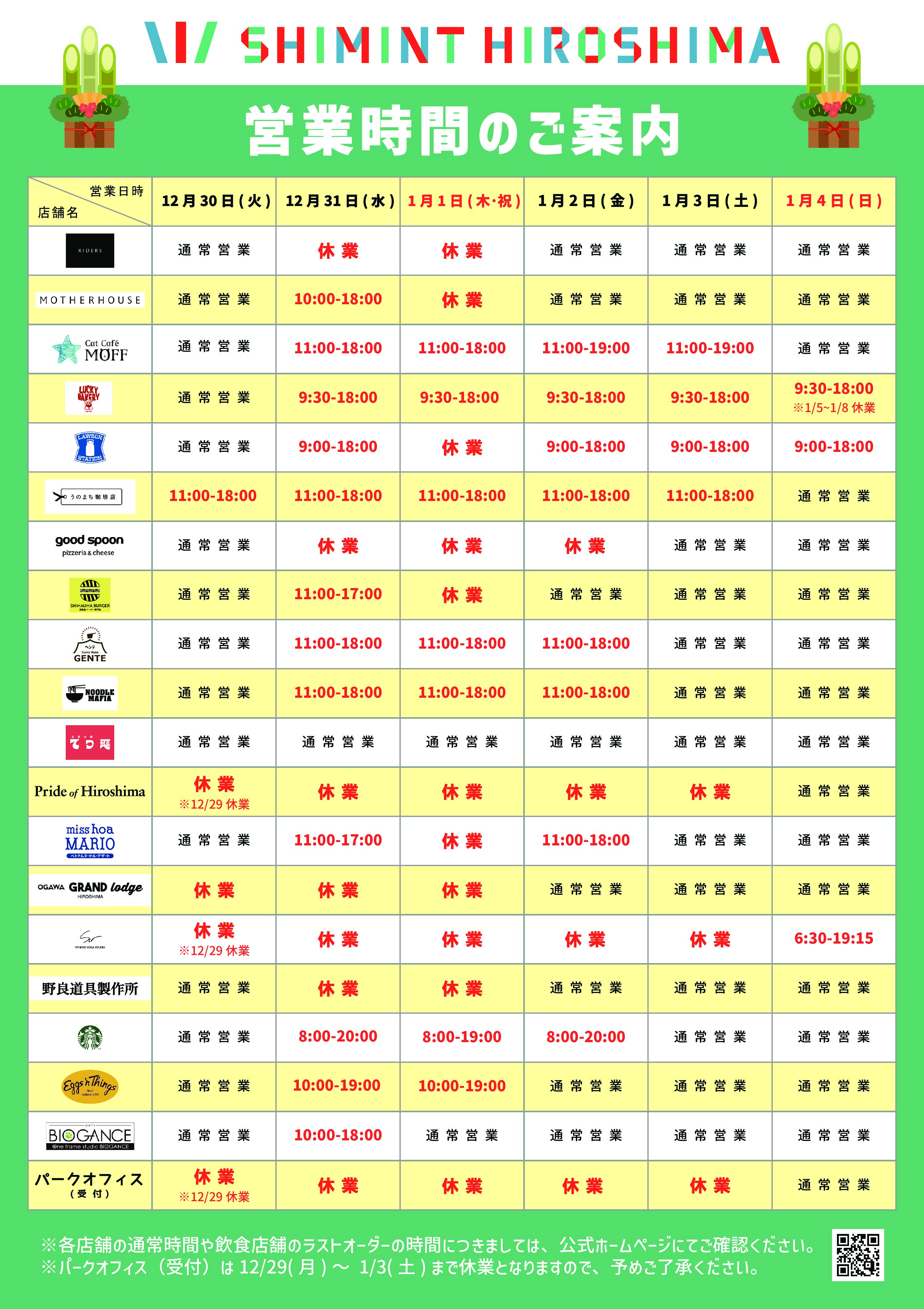 いつもシミントひろしまをご利用いただきありがとうございます。 年末年始の営業時間をご案内いたします。 尚、店舗ごとの詳細につきましては、各店舗へお問合せください。